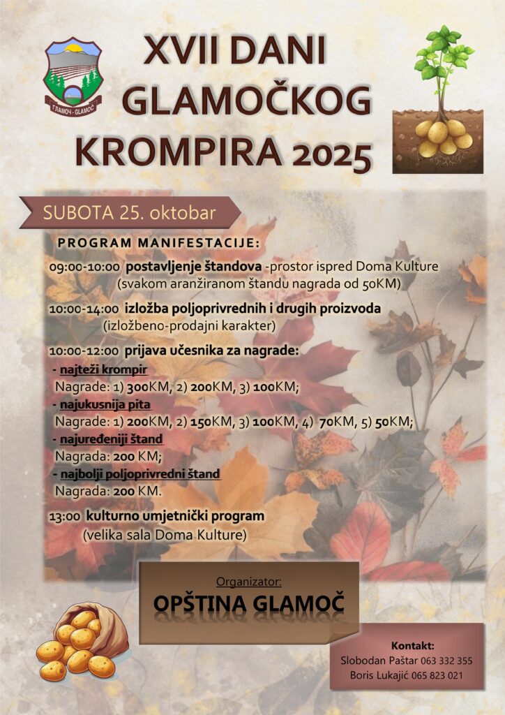Обавјештавамо све заинтересоване пољопривредне произвођаче и излагаче, као и све грађане, да ће се XVII Дани гламочког кромпира одржати 25.10.2025. године (субота) на платоу испред КОУ “Народни универзитет Гламоч” Гламоч.
